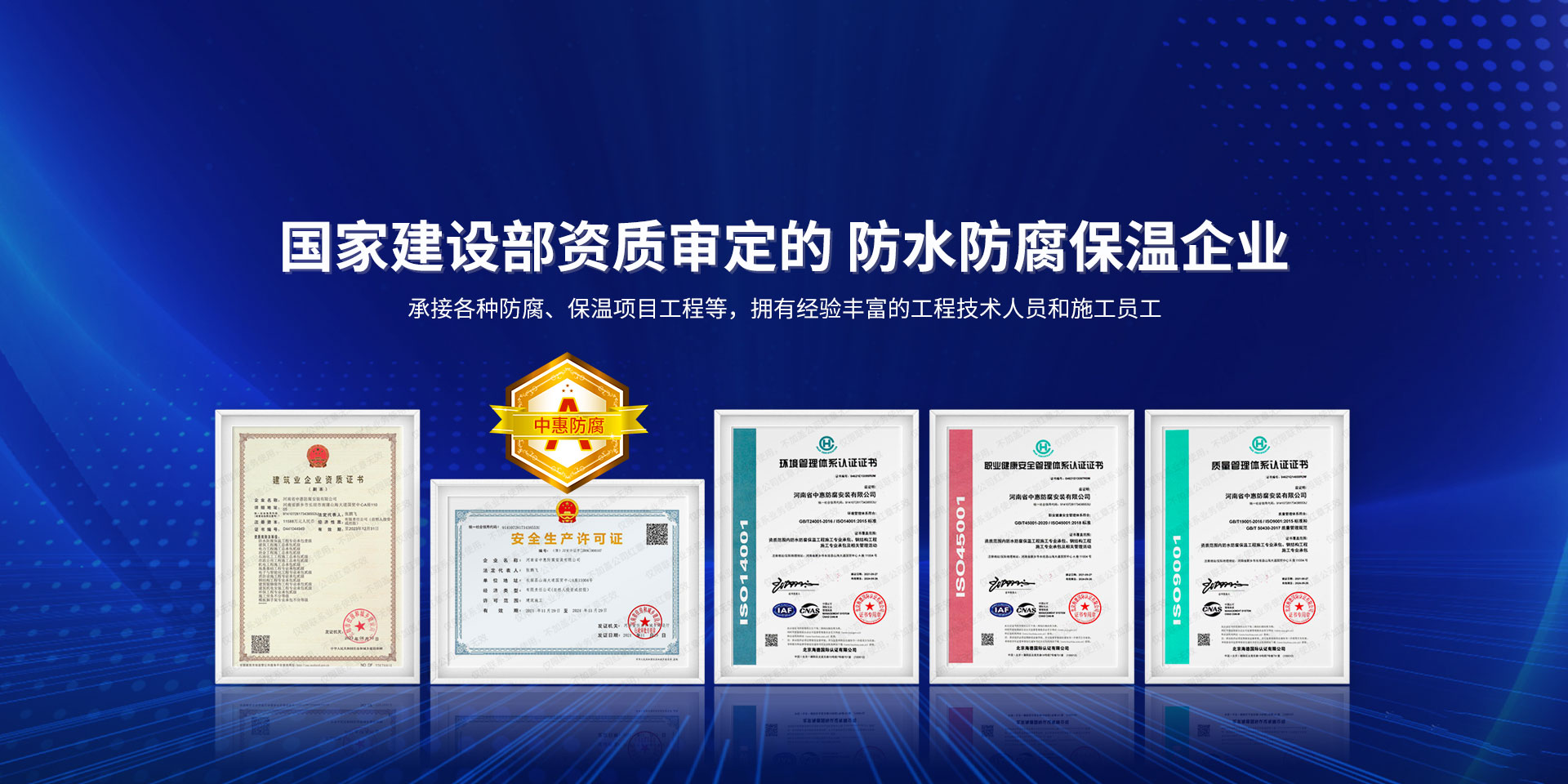 公司經營范圍:防水防腐保溫工程;消防設施工程;建筑裝修裝飾工程;建筑機電安裝工程;電力工程;建筑工程;石油化工工程;工業清洗工程;油罐清洗工程;鋼結構工程;環保工程;模板腳手架工程;電纜防火封堵、防污閃噴涂、外墻外保溫工程;各類施工勞務作業;設備維修、船舶鉚焊、涂裝;電力工程材料、建材、防水材料、防火材料、防腐保溫材料銷售,并相繼通過了GB/T19001-2008idtISO9001:2008GB/T50430-2007質量管理體系認證證書。GB/T24001-2004idtISO14001:2004環境管理體系認證證書。GB/T28001-2011idtOHSAS18001:2007職業健康安全管理體系認證證書。公司是中國防腐蝕于防護協會、中國施工企業管理協會、電力協會和中國鋼結構防水協會會員單位。 公司的經營業務涵蓋了石油、化工、電力、冶金、煤炭、船舶、國防、燃氣、水利、環保、交通運輸、航空及國防軍工和輕紡市政等行業的防腐保溫絕熱設備。鋼結構安裝、防火、防水、金屬噴鍍、聚脲噴繪、陰極保護、防滲透堵漏、玻璃鋼及各種磚版材料襯里、橡膠襯里、煙氣硫和耐酸溶劑腐蝕等工程施工。公司連續十年榮獲“省市先進施工企業”“安全生產先進單位”“重合同,守信用企業”和“AA***資質企業”的稱號。2000年被命名為市級文明單位,2002年被國家工商行政管理局命名為“重合同,守信用的企業”、被中國工業防腐蝕技術協會命名為“防腐蝕企業,能源節約及環境保護領域有豐富的經驗和***的業績。工程一次交驗合格率100%。其中攀枝花鋼鐵公司煉鐵廠四號高爐及熱風爐防腐工程、上海寶鋼公司煤氣柜防腐工程、撫順石油一廠裝置防腐項目、齊魯石化公司稀烴廠高塔防腐工程、吉林化學工業公司煉油廠油罐防腐工程、天津石化熱電廠六號爐頂棚聯絡管保溫工程、大慶油田(太倉)力神泵業工程、中國化學工程第十一建設工程、中原油田勘探局工程、中國石化銷售有限公司華北分部、魯皖輸油管道工程、貴州開磷息烽合成氨工程、陜西黃陵煤化工程、中國石油天然氣西部管道塔里木輸油工程、邯鋼集團邯寶鋼鐵公司煉鐵工程、德州供電工程、吉寶(南通)船廠工程,偃師華潤熱力工程、鄭州熱力總公司。 河南省中惠防腐安裝有限公司愿以豐富的施工經驗,***的技術,***的設備,***的管理,***的服務,竭誠為國內外廣大的用戶提供***滿意、******的工程作品。 我公司愿與國內外同仁一道,團結協作,共同推進防腐蝕行業發展! 公司地址:河南省長垣縣建設路北段360號 固定電話:0373-8866488 郵編:453400 網址:http://www_zhff_com_cn.tiankuochongkongwang.com